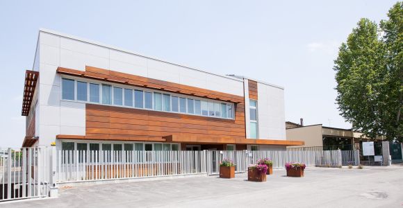 L’elevazione dell’edificio è stata realizzata attraverso una struttura prefabbricata costituita da pilastri e travi in c.a. e da solai a pannelli prefabbricati in c.a.p. con soletta collaborante gettata in opera. La maggior parte delle pareti di tamponamento esterne sono state realizzate con struttura a pannelli prefabbricati, rivestita da una facciata ventilata montata a secco sui pannelli stessi, costituita da pannelli in fibrocemento e doghe in acciaio Cor-Ten.