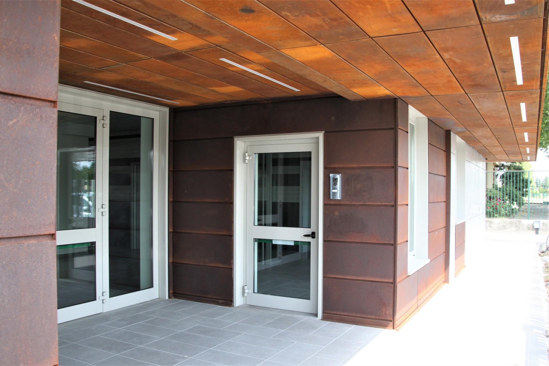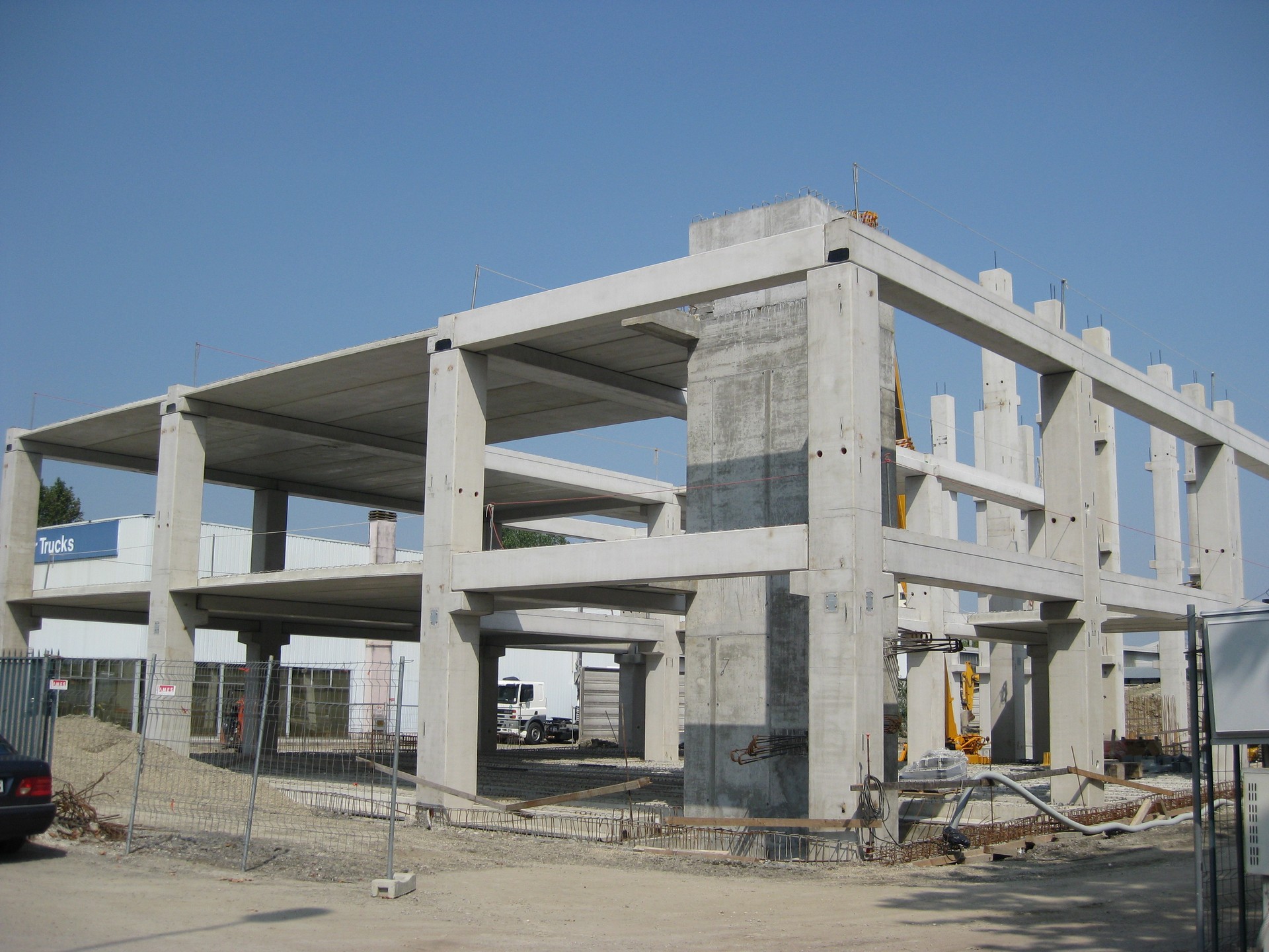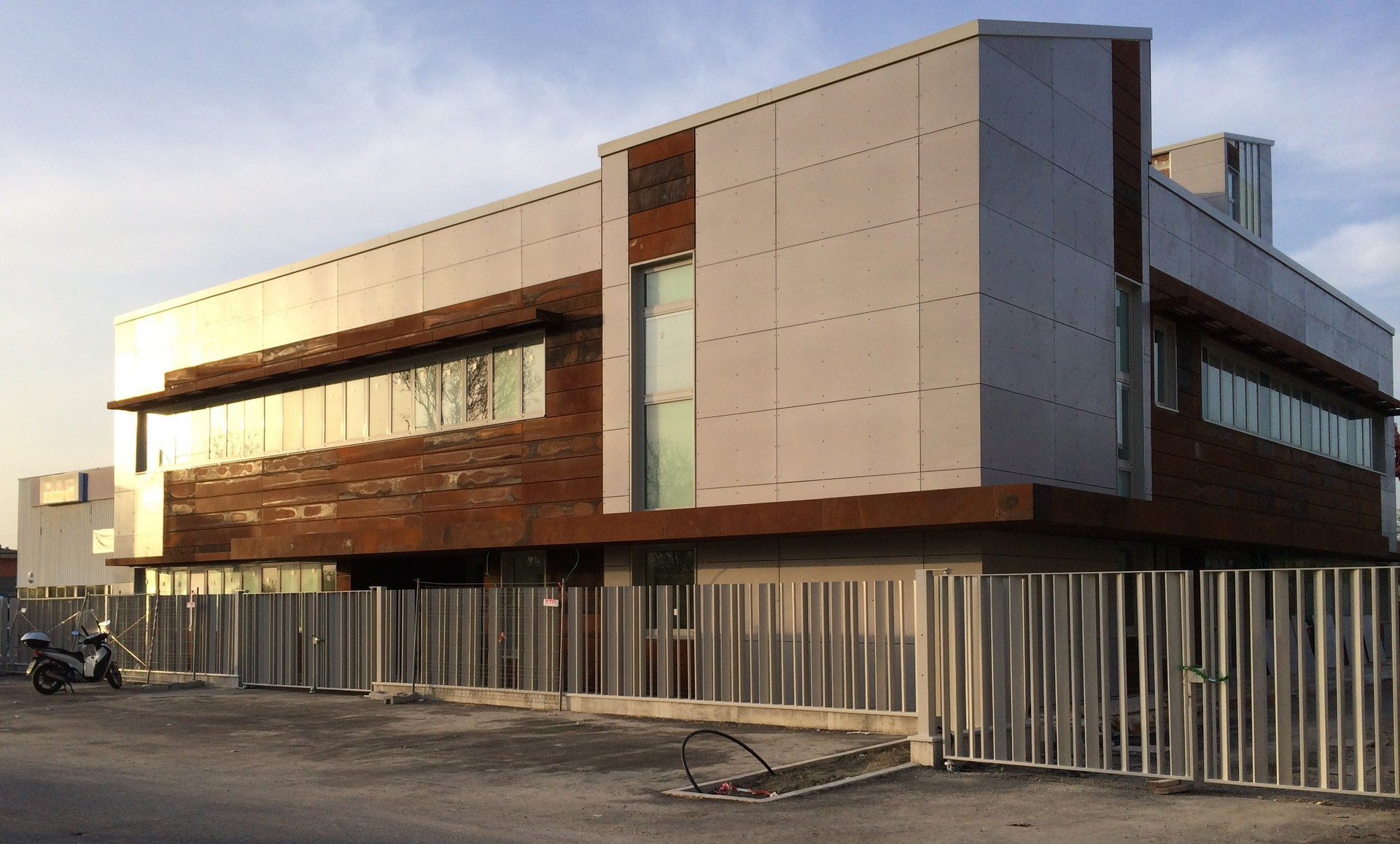 L’elevazione dell’edificio è stata realizzata attraverso una struttura prefabbricata costituita da pilastri e travi in c.a. e da solai a pannelli prefabbricati in c.a.p. con soletta collaborante gettata in opera. La maggior parte delle pareti di tamponamento esterne sono state realizzate con struttura a pannelli prefabbricati, rivestita da una facciata ventilata montata a secco sui pannelli stessi, costituita da pannelli in fibrocemento e doghe in acciaio Cor-Ten.