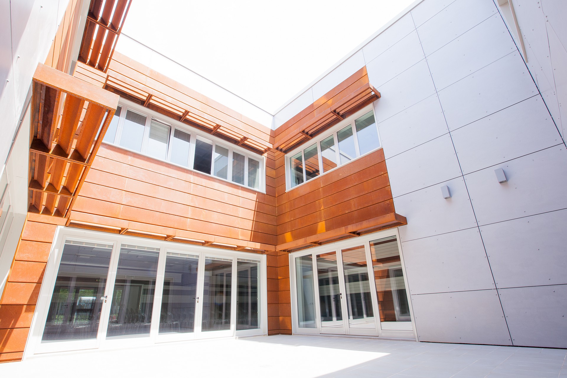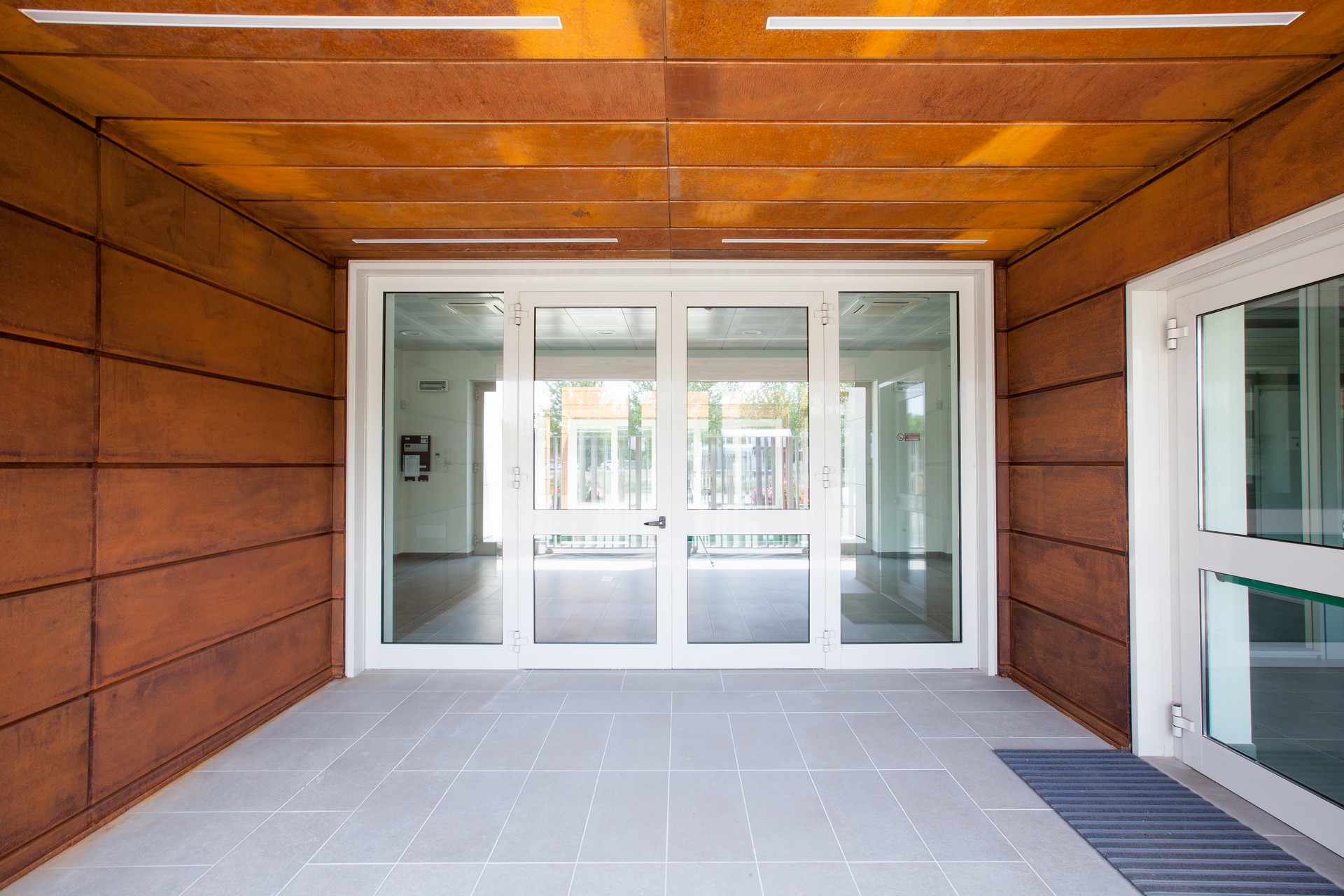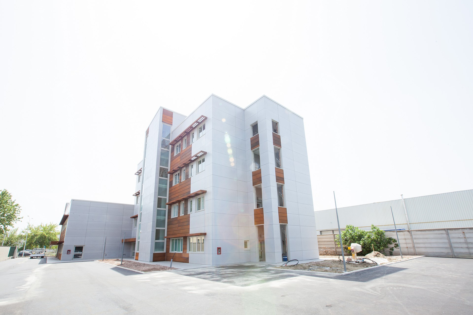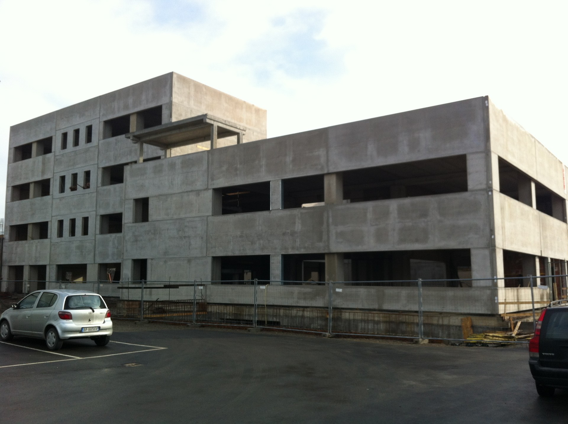 L’elevazione dell’edificio è stata realizzata attraverso una struttura prefabbricata costituita da pilastri e travi in c.a. e da solai a pannelli prefabbricati in c.a.p. con soletta collaborante gettata in opera. La maggior parte delle pareti di tamponamento esterne sono state realizzate con struttura a pannelli prefabbricati, rivestita da una facciata ventilata montata a secco sui pannelli stessi, costituita da pannelli in fibrocemento e doghe in acciaio Cor-Ten.